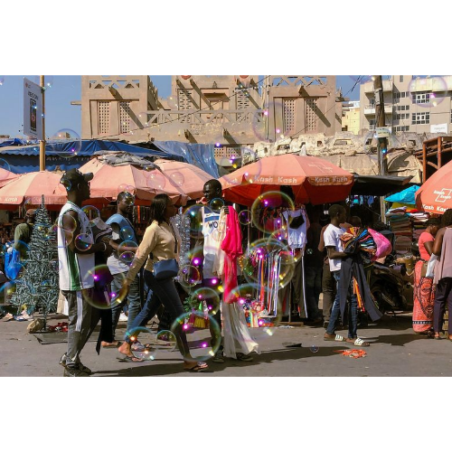 Lunettes de soleil sur la tête, iPhone à la main, elle parcourt Sandaga à la recherche de la déco parfaite pour son feed. Elle photographie tout, négocie mollement (papa payera), et cherche désespérément des décorations “aesthetic”,”minimalistic”, dans un marché où tout brille déjà de mille feux.
